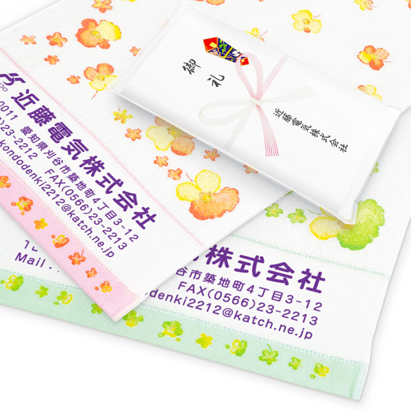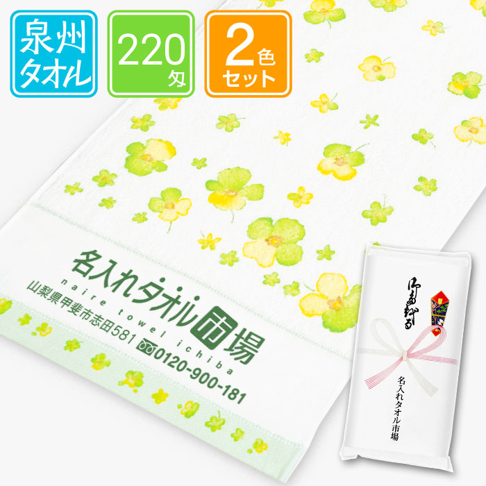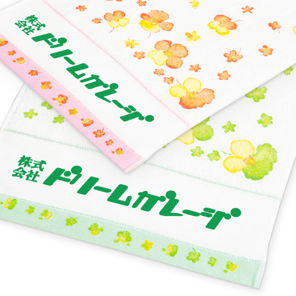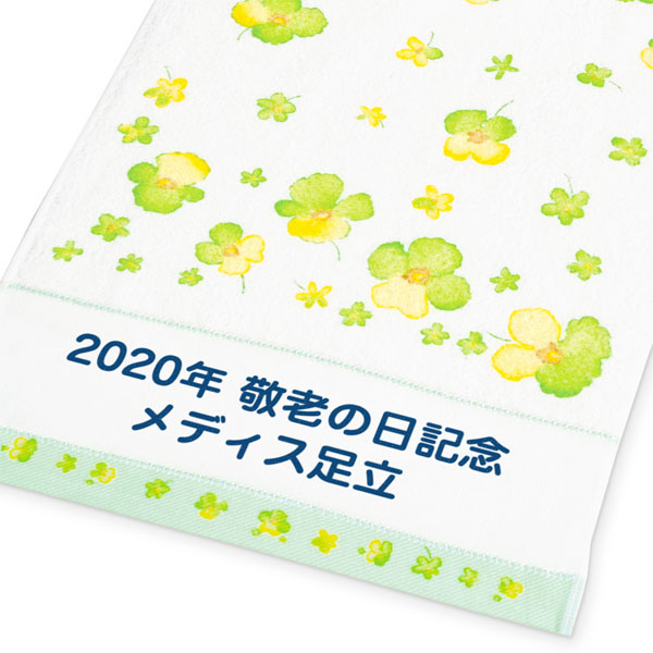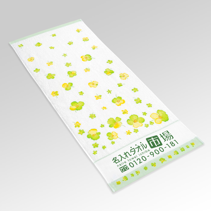 タオル生地に明るい色で花柄を印刷したポップクローバー。こちらのタオルは親近感の沸きやすいデザインで、子供たちに人気の名入れタオルです。 タオル生地には安心の国産泉州タオルを使用しています。泉州タオル特有の後晒し工程により、不純物を洗い流してお届けしますので、とても清潔で、衛生面も安心。さらに綿素材の優しい触り心地で、子供や赤ちゃんの肌にも安心して使っていただく事ができます。 タオル生地はやや厚めの220匁で耐久性にも優れます。幼稚園・保育園や医療・福祉施設などの粗品・記念品におすすめの名入れタオルです。 子供達にはオレンジや水色など、明るい色の名入れ文字が人気です。 ※名入れタオル市場の泉州タオルは、大阪の伝統ある老舗企業のタオルのみを使用し、品質にもこだわった名入れタオルをお届けしています。 ※ベタ(塗りつぶし)部分が多いデザインは印刷をお受けできない場合があります。 イラストレーターデータ入稿用テンプレート(片側印刷用)