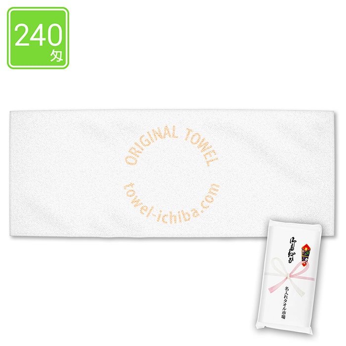 やや厚手の240匁の生地を使用して作成する捺染タオルです。1枚当たりの重さは約82g程度。厚手なので質感もしっかりしており、触り心地も柔らかく気持ちの良い仕上がりになります。主な用途としては記念品や贈答品など、ちょっと良いものを用意したいという時におすすめです。しっかりした生地の厚みと捺染タオルの特徴的な名入れで、渡した相手の方にもきっと喜んでもらえます。ただ、濡らして使う時はやや絞りにくいので、銭湯や旅館の浴用タオルとして作成する場合は220匁以下の生地厚がおすすめです。