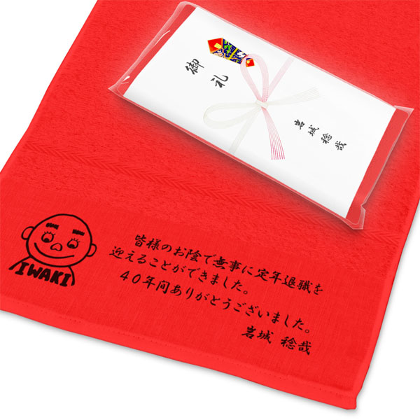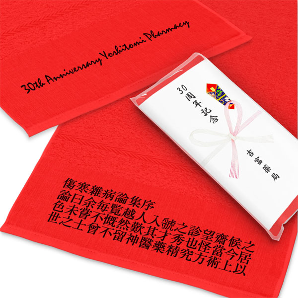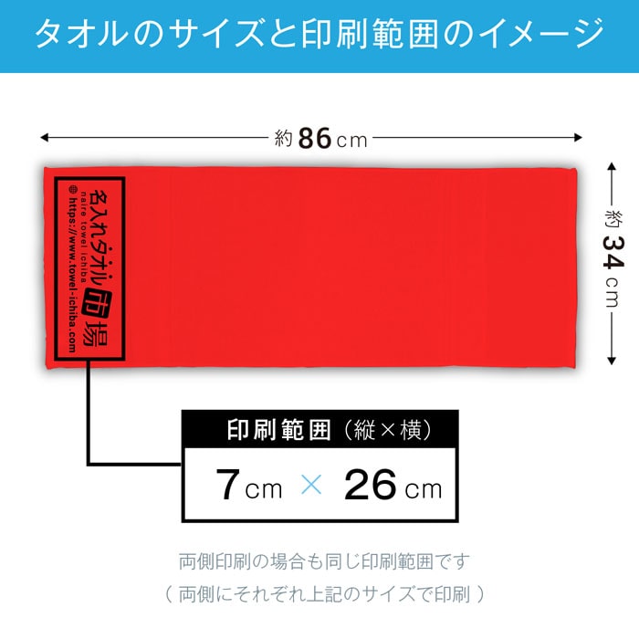 赤!赤!赤!インパクト大、注目度抜群の名入れタオルです。赤いタオルに名入れしたい方はこの商品をご利用ください。鮮やかな色になるように染めこんでいるので価格は高めですが、満足度の高い名入れタオルに仕上げることができます。赤色のタオルはとにかく目立つので、名入れした文字もとてもおぼえてもらいやすくなりますよ。他にはない、特徴的な名入れタオルを作りたいという方はぜひご利用ください。 名入れの印刷色についてですが、下地の赤色が強いため、基本的に黒色印刷での対応となります。他の印刷色でのご対応も可能ですが、色味が変わりますので一度ご相談ください。 ※名入れタオル市場の泉州タオルは、大阪の伝統ある老舗企業のタオルのみを使用し、品質にもこだわった名入れタオルをお届けしています。 ※ベタ(塗りつぶし)部分が多いデザインは印刷をお受けできない場合があります。 泉州名入れタオル 白生地はこちら イラストレーターデータ入稿用テンプレート(片側印刷用) イラストレーターデータ入稿用テンプレート(両側印刷用)