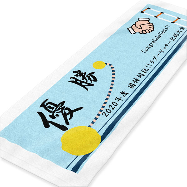サイズ:スポーツタオル生地色:白印刷方法:広範囲印刷印刷色:黒・オレンジ(160)・肌色(2028)・濃紺(435)・黄色(2074)・水色(2167)の6色印刷レイアウト:データ入稿イラスト・ロゴ:データ入稿