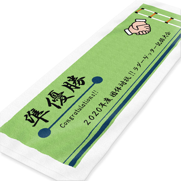 サイズ:スポーツタオル生地色:白印刷方法:広範囲印刷印刷色:黒・オレンジ(160)・濃紺(435)・緑(2105)・ピンク(2028)の5色印刷レイアウト:データ入稿イラスト・ロゴ:データ入稿