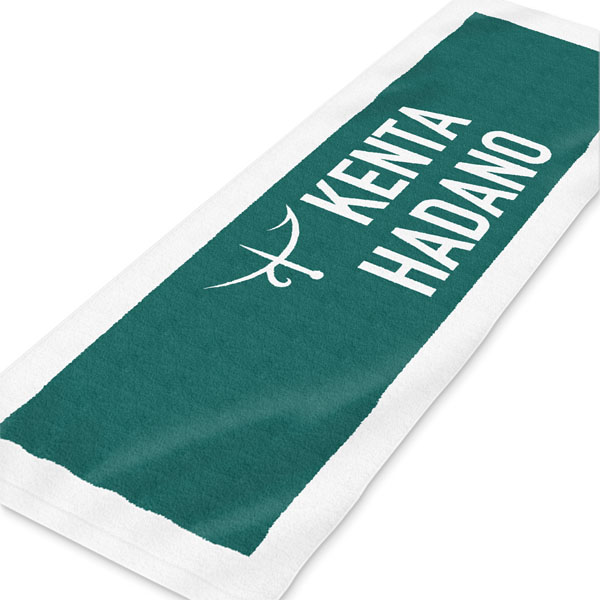 サイズ:スポーツタオル生地色:白印刷方法:広範囲印刷印刷色:緑(DIC2358)書体:データ入稿レイアウトNo:3004イラスト・ロゴ:画像データ入稿