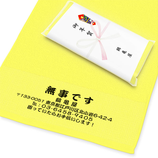 生地色:黄印刷方法:片側1色名入れ印刷色:黒書体:勘亭流レイアウト:5行タイプイラスト・ロゴ:なし