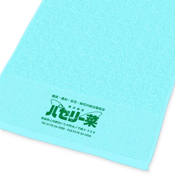 生地色:青印刷方法:片側1色名入れ印刷色:緑(2561)書体:データ入稿レイアウト:4行タイプイラスト・ロゴ:データ入稿
